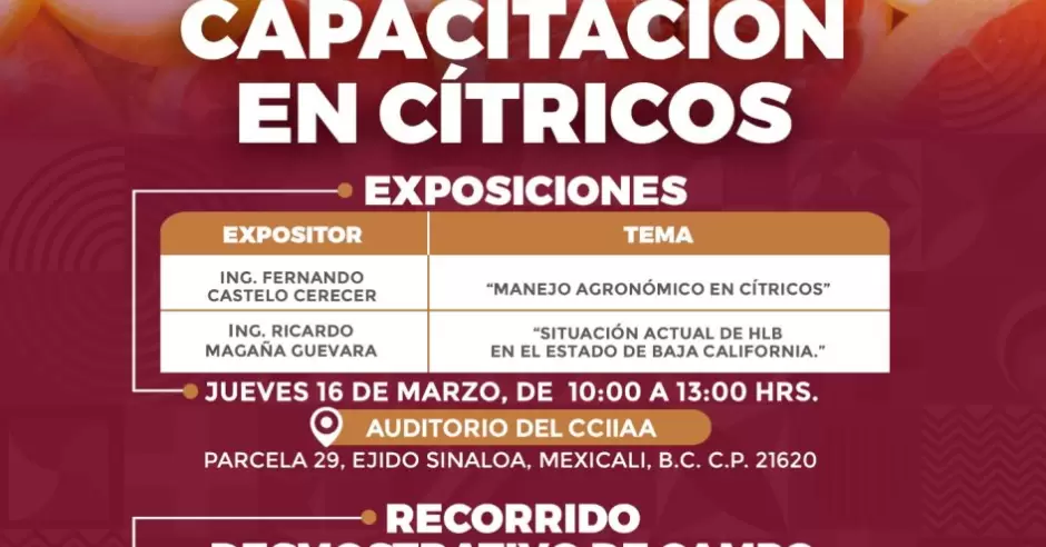 El jueves 16 de marzo, en el auditorio del CCIIAA se iniciará con las capacitaciones y se hablará sobre el "Manejo Agronómico en Cítricos", a cargo del expositor, Fernando Castelo Cerecer, y de "La Situación Actual del Huang Long Bing (HLB) en el Estado de Baja California" a través del experto, Ricardo Magaña Guevara.