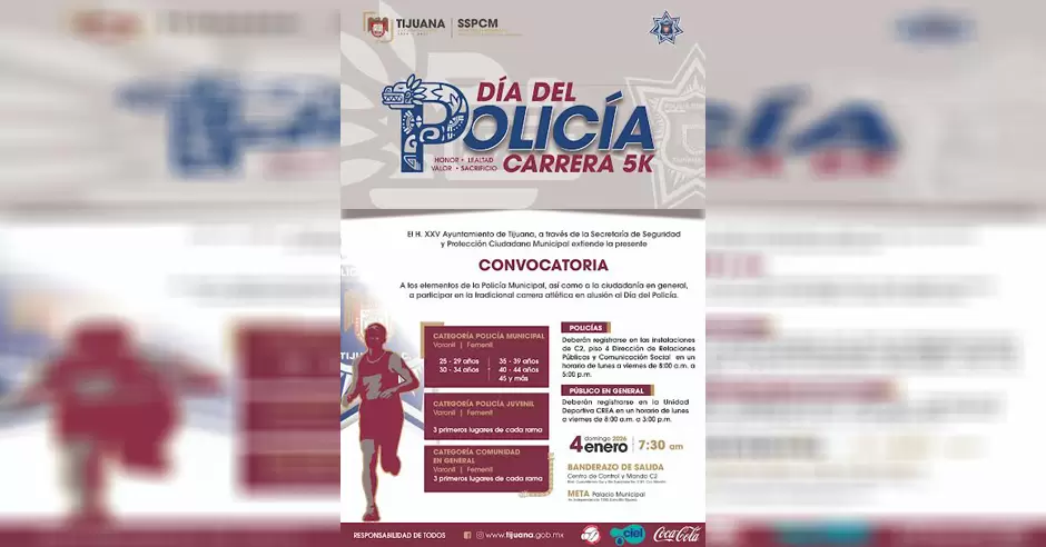 TIJUANA.- En el marco de la celebración del Día del Policía, la Secretaría de Seguridad y Protección Ciudadana Municipal (SSPCM), en coordinación con el Instituto Municipal del Deporte de Tijuana (IMDET), invita a la comunidad tijuanense a sumarse a la carrera de 5 kilómetros "Día del Policía 2026", en la que ciudadanía y agentes de la Policía Municipal correrán lado a lado.