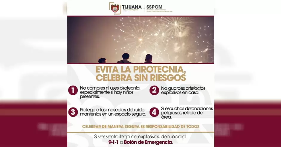 TIJUANA.- Con motivo de las celebraciones de Año Nuevo, la Secretaría de Seguridad y Protección Ciudadana Municipal (SSPCM) hace un llamado a la ciudadanía a realizar festejos seguros y responsables, a fin de prevenir accidentes y situaciones de riesgo, y garantizar un cierre de año en paz para todas las familias.