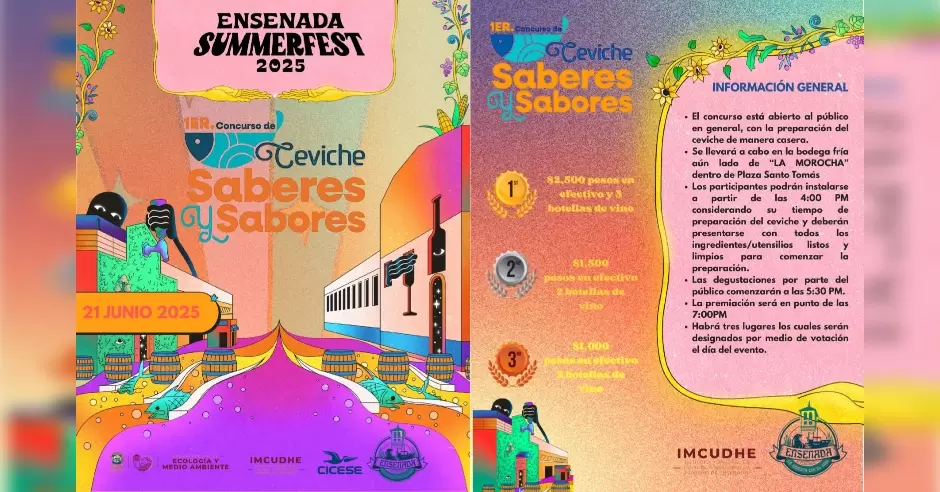 ENSENADA.- Con premios de hasta 2 mil 500 pesos y botella de vino, el próximo 21 de junio se llevará a cabo en la Plaza Santo Tomás, el Primer concurso de ceviche "Saberes y Sabores", que organiza el Gobierno de Ensenada, en coordinación con el Cicese.