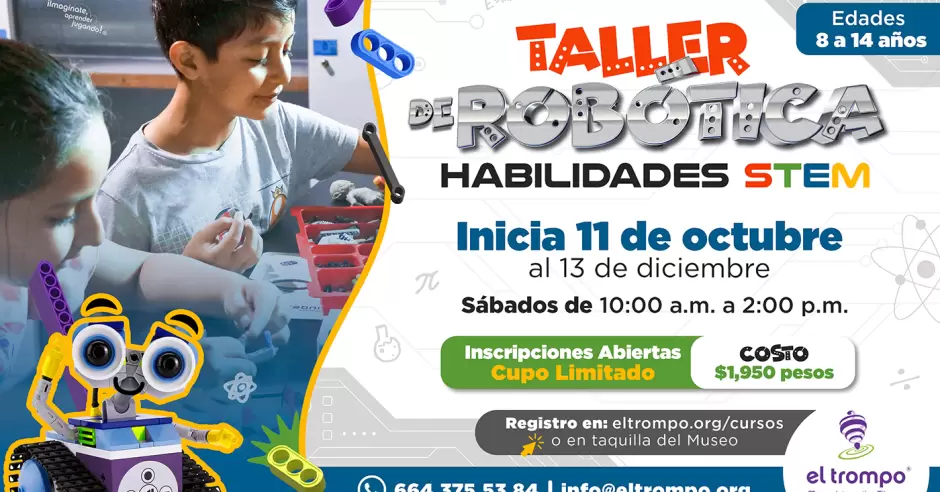 Tijuana.- El Trompo anuncia la apertura de la nueva temporada del Taller de Robótica, diseñado para niños de 8 a 14 años. Con el objetivo de fomentar habilidades en ciencia, tecnología, ingeniería y matemáticas (STEM), el programa se llevará a cabo de manera presencial durante 10 sábados consecutivos, a partir del 11 de octubre hasta diciembre, con un horario de 10:00 a 14:00 horas.