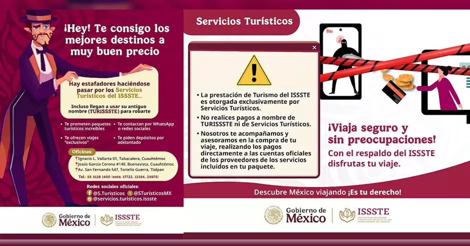 El ISSSTE pide a la derechohabiencia verificar que toda información provenga de las cuentas oficiales de los proveedores de servicios y reitera que la unidad de Servicios Turísticos acompaña sin costo a la derechohabiencia en cada paso para brindarles confianza y tranquilidad.