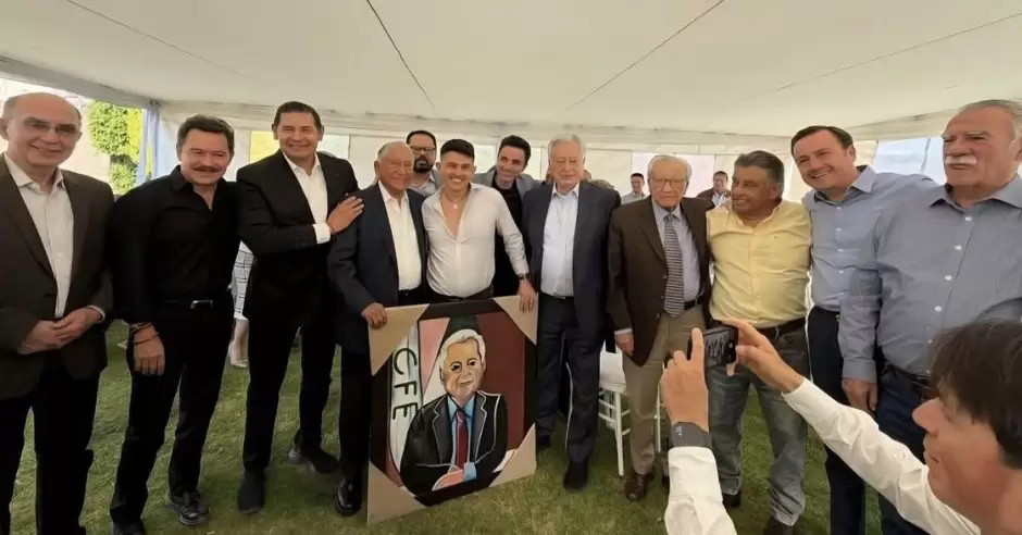 El anfitrión, Carlos Meza Viveros, estuvo acompañado de su hijo Carlos Meza Torres, quien obsequió al homenajeado un retrato del exgobernador con las iniciales de la CFE, en referencia a su paso por la empresa productiva del Estado.