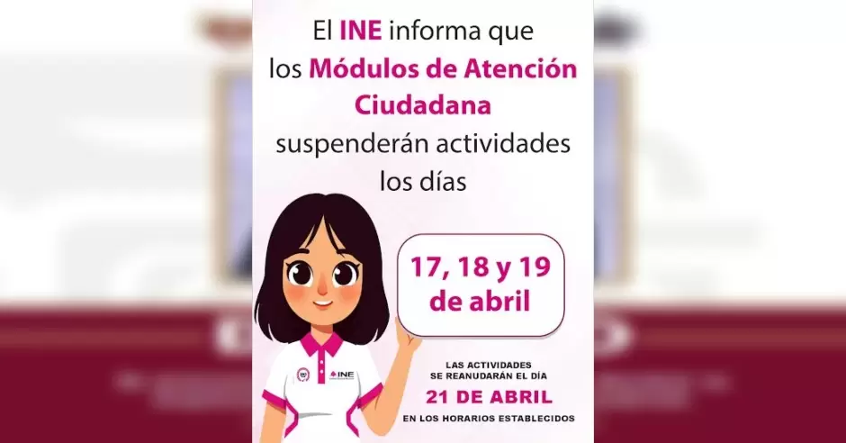 BAJA CALIFORNIA.-El Instituto Nacional Electoral en Baja California (INE BC) informa que los días 17, 18 y 19 de abril de 2025 los dieciséis Módulos de Atención Ciudadana (MAC) Fijos distribuidos a nivel estatal suspenderán actividades.