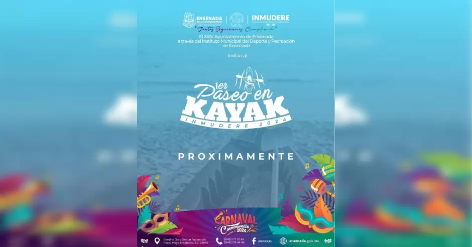 ENSENADA.- El Instituto Municipal del Deporte y Recreación de Ensenada (Inmudere), informó a la comunidad que, por razones de seguridad y debido a las condiciones desfavorables en la marea, se ha pospuesto el 1er. Paseo en Kayak que se realizaría en el marco del Carnaval Conmemorativo de Ensenada 2024.