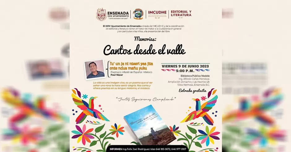 ENSENADA.- Las memorias "Cantos desde el Valle", serán presentadas en la Biblioteca Pública Modelo, por el escritor Paúl Nazar, este viernes 9 de junio, a las 5:00 de la tarde.