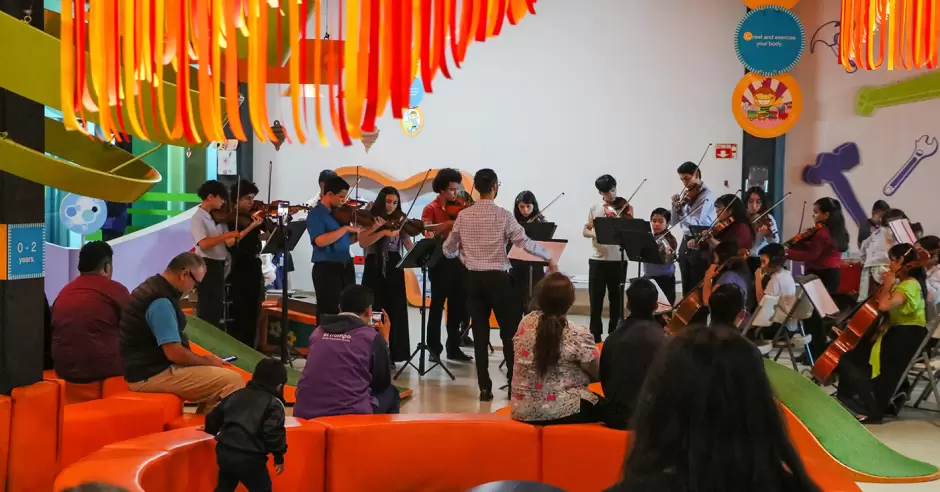 El juego de los pequeños como parte integrada de la experiencia simultánea al tocar del Ensamble de Cuerdas de la Orquesta Cerro Colorado, fue la dinámica que adquirió un evento de una nutrida asistencia entre padres de familia y niños de edad de bebés a preescolar, para acercarlos desde tempranas etapas a las emociones musicales.