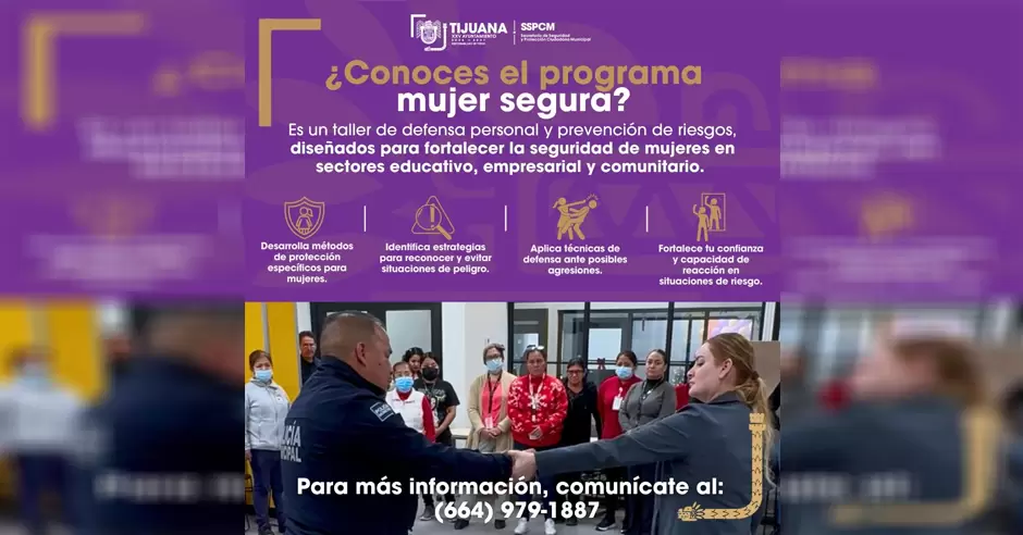 La Secretaría de Seguridad y Protección Ciudadana Municipal reafirma su compromiso de trabajar en la prevención y erradicación de la violencia contra las mujeres, garantizando su derecho a vivir en un ambiente de tranquilidad, invitándolas a solicitar mayor información sobre el programa, a través del número 664 979 18 87.