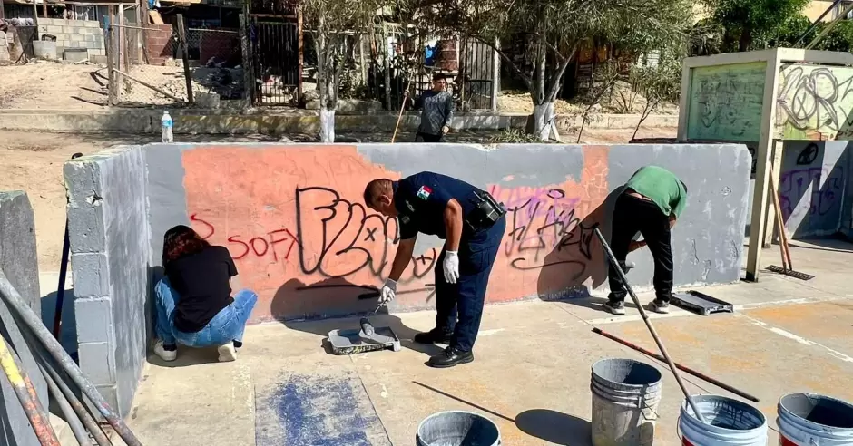 TIJUANA.- Con el objetivo de mejorar los espacios públicos y fomentar la participación ciudadana, elementos de Proximidad Social y Vinculación, de la Secretaría de Seguridad y Protección Ciudadana Municipal (SSPCM), en coordinación con la Secretaría de Seguridad Ciudadana del Estado y ciudadanía, llevaron a cabo una jornada de limpieza y eliminación de grafiti en el Parque Homex Beta 2, ubicado en Cañadas del Florido.