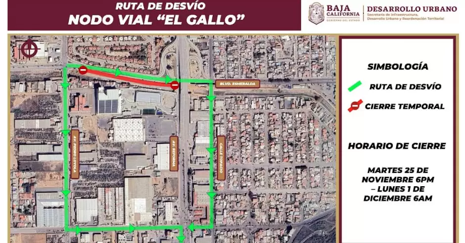 Espinoza Jaramillo señaló que como ruta alterna, quienes se dirijan hacia la zona sur de Ensenada deberán utilizar el carril inferior para cruzar el nodo El Gallo y posteriormente utilizar la calle Topacio para incorporarse nuevamente a la avenida Reforma.