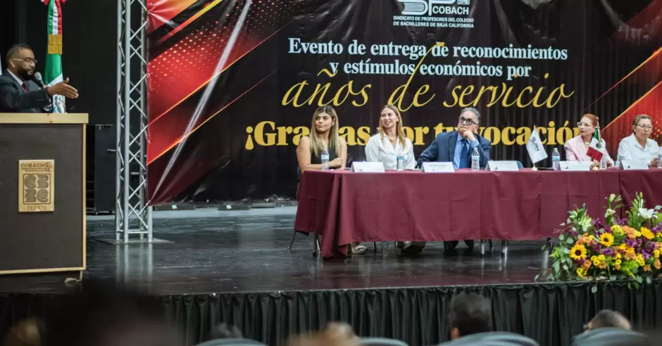 TECATE.- En el marco de la conmemoración del Día de la Maestra y el Maestro, el Colegio de Bachilleres del Estado de Baja California (COBACH BC) y el Sindicato de Profesores, llevaron a cabo la ceremonia de entrega de reconocimientos y estímulos por 10 hasta 40 años de servicio a 53 docentes de toda la entidad, quienes han contribuido con entrega y profesionalismo a la formación de generaciones de estudiantes.