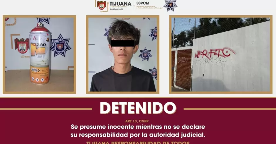 TIJUANA.- La Secretaría de Seguridad y Protección Ciudadana Municipal (SSPCM), informa que como parte de las acciones preventivas que se implementan en las inmediaciones de planteles educativos durante el periodo vacacional, con el objetivo de evitar actos de vandalismo, logró la detención de un individuo presuntamente responsable de realizar grafitis en una escuela ubicada en el fraccionamiento Villas Santa Fe.
