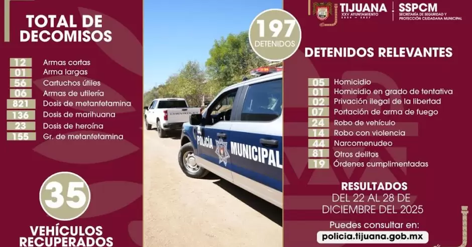 TIJUANA.- Como parte de las estrategias de seguridad implementadas por la Secretaría de Seguridad y Protección Ciudadana Municipal (SSPCM), bajo la supervisión del presidente municipal, Ismael Burgueño Ruiz, durante la semana del 22 al 28 de diciembre de 2025 la Policía Municipal de Tijuana reforzó acciones preventivas y operativas que derivaron en la detención de 197 personas por su presunta participación en diversos delitos.