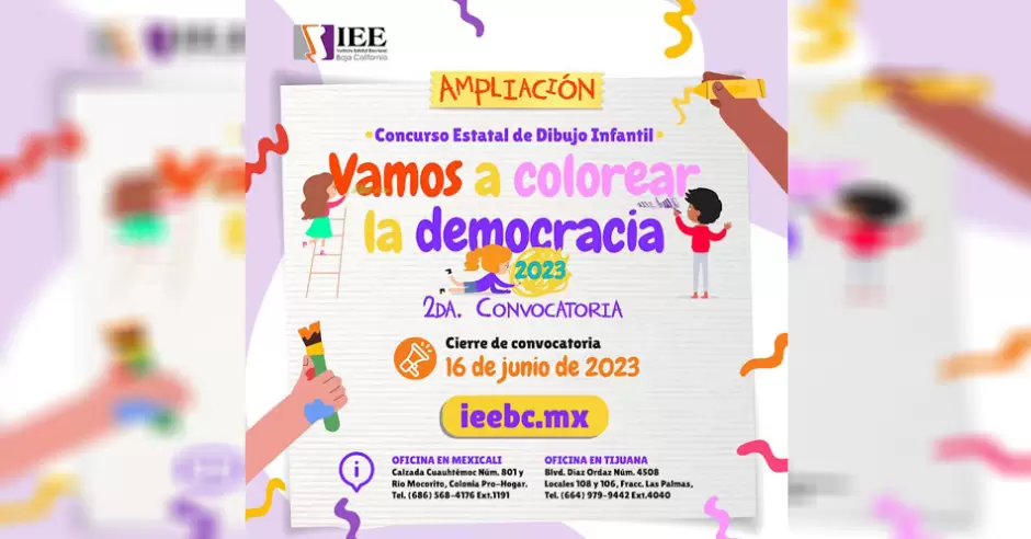 MEXICALI.- Con el objetivo de fomentar la participación entre la niñez de Baja California a través de expresiones artísticas que den cuenta sobre los valores de la democracia y la construcción de ciudadanía, el Instituto Estatal Electoral de Baja California (IEEBC), vía la Comisión de Participación Ciudadana y Educación Cívica, reitera la invitación a niñas y niños de entre 6 y 8 años de edad residentes de esta entidad, a participar en el concurso estatal de dibujo infantil "Vamos a Colorear la Democracia".