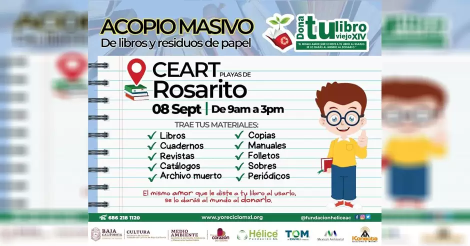 PLAYAS DE ROSARITO.- Para promover entre la comunidad educativa el cuidado del medio ambiente, la Secretaría de Educación (SE) se suma al esfuerzo de la Fundación Hélice con la campaña de "Dona tu libro viejo" donde se tiene como objetivo el reciclaje y la promoción a la lectura.