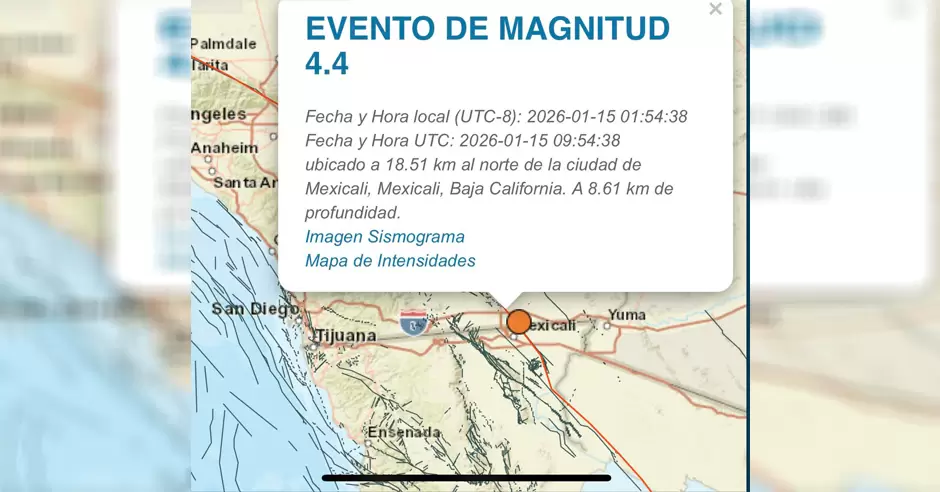 MEXICALI.- Durante la madrugada de este jueves 15 de enero se registró un sismo de magnitud preliminar 4.4, con epicentro en el Centro de California, de acuerdo con información del Centro de Investigación Científica y de Educación Superior de Ensenada (CICESE). El movimiento telúrico fue percibido en Mexicali y en municipios cercanos.
