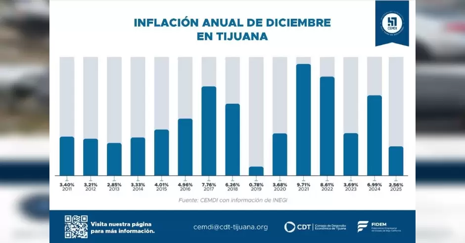 TIJUANA.- El Centro Metropolitano de Información Económica y Empresarial (CEMDI) llevó a cabo un análisis acerca del estado y evolución de la inflación en Baja California y Tijuana a partir de los datos referentes a diciembre de 2025.