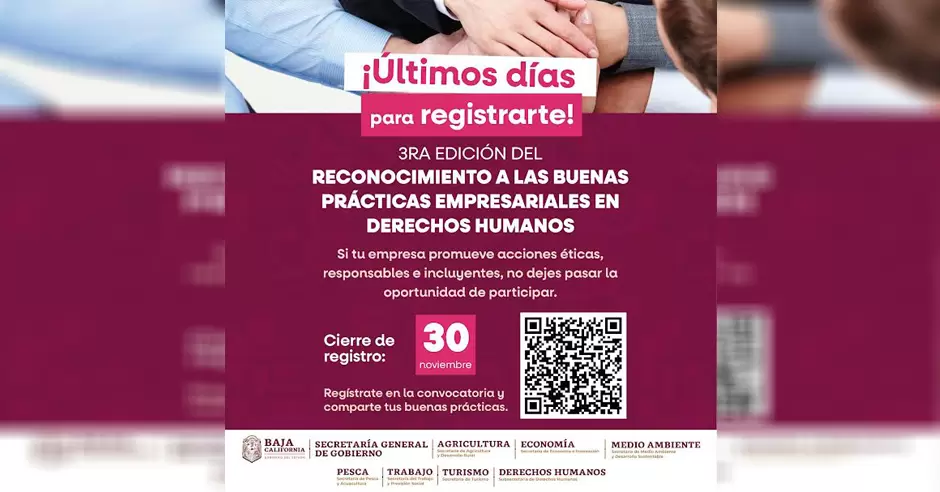 TIJUANA.- Siguiendo la instrucción de la Gobernadora Marina del Pilar Avila Olmeda de impulsar a las empresas que respetan los derechos humanos, el Gobierno del Estado hace un llamado a las empresas en Baja California para participar en la Tercera Edición del Reconocimiento a las Buenas Prácticas Empresariales en Materia de Derechos Humanos, cuya convocatoria se encuentra en su etapa final.