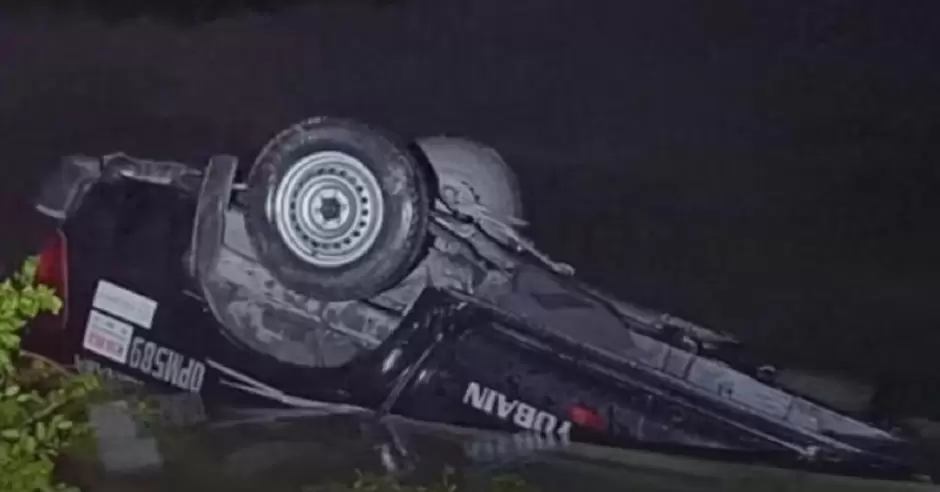 La maniobra provocó que el conductor perdiera el control del vehículo, saliéndose de la cinta asfáltica hasta terminar volcado con las llantas hacia arriba dentro de la zona de agua y lodo.