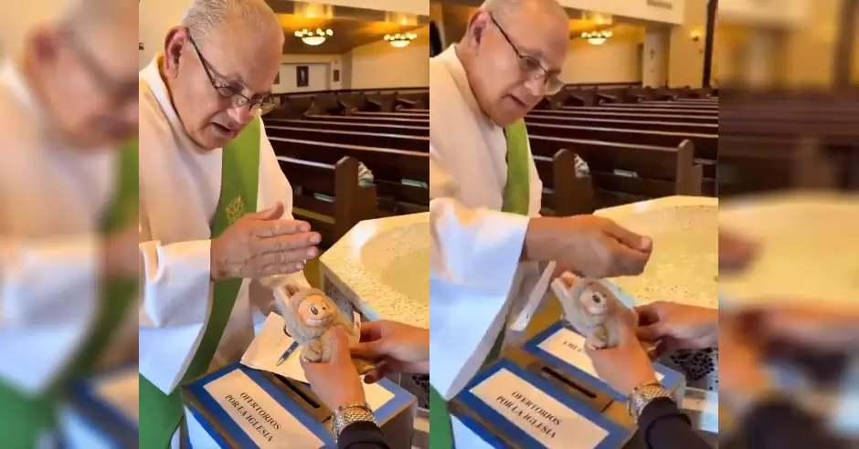 La grabación, de pocos segundos de duración, mostró al religioso dentro de una iglesia mientras rociaba agua bendita sobre el juguete y pronunciaba oraciones en español. Al finalizar, trazó la señal de la cruz, dando por concluido el acto.
