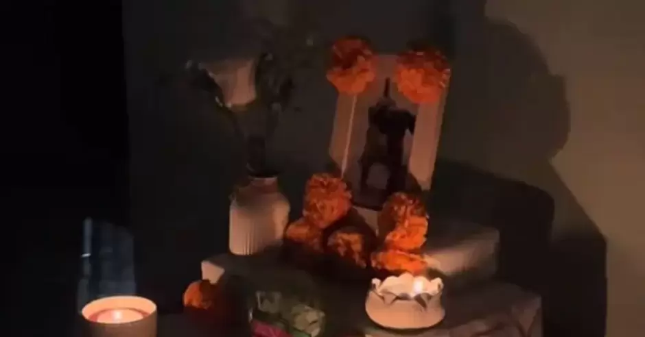El clip destaca por el pequeño altar adornado con veladoras y flor de cempasúchil, teniendo en el centro la foto del cachorro.